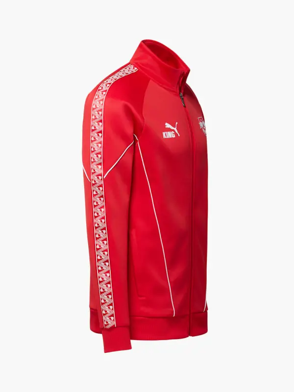 Blending retro vibes with modern functionality and comfort, the RB Leipzig PUMA KING Jacket for men is the perfect pre-game layer for fans. The bold sleeve print sits alongside team branding for an authentic vintage look.